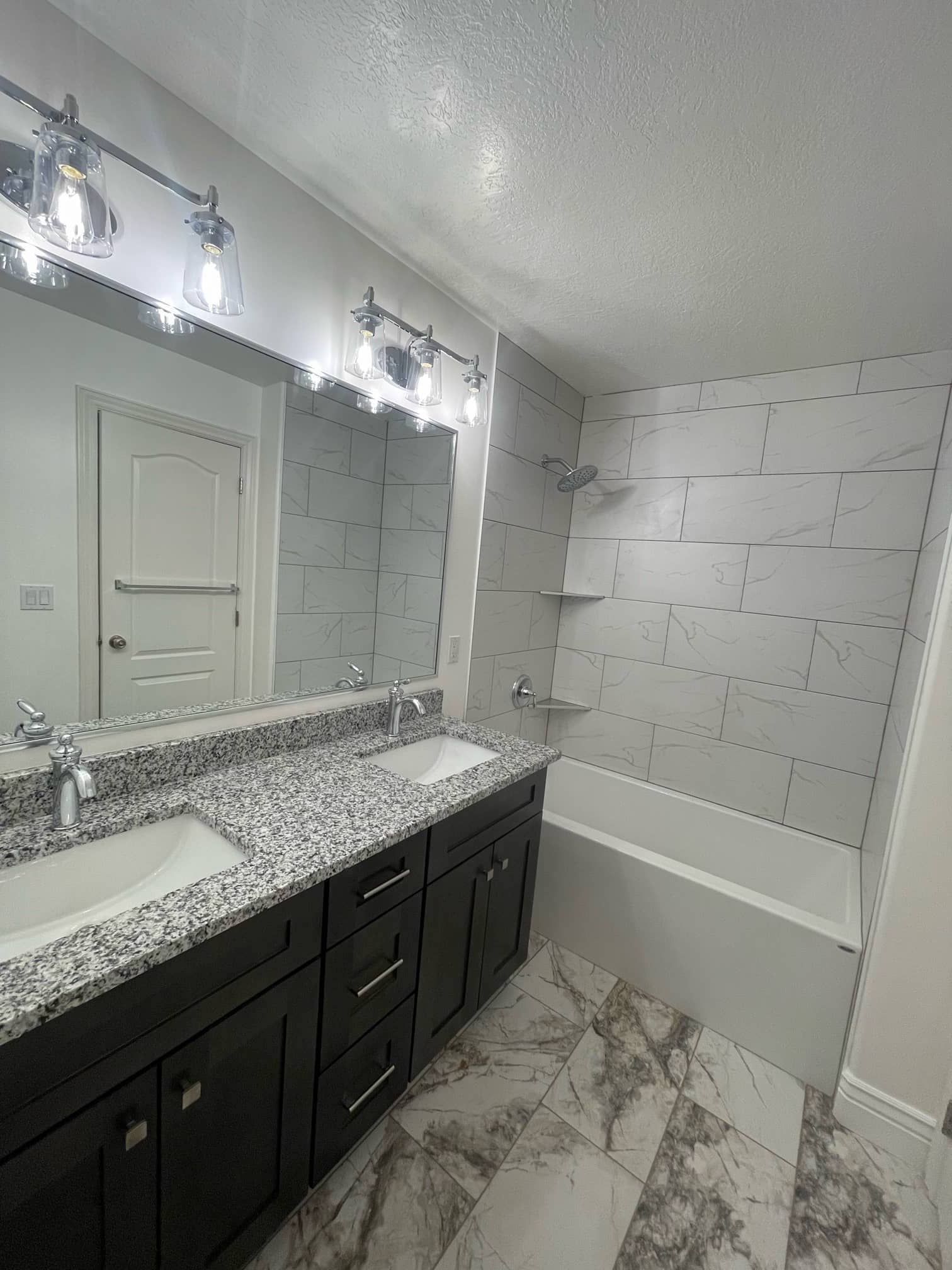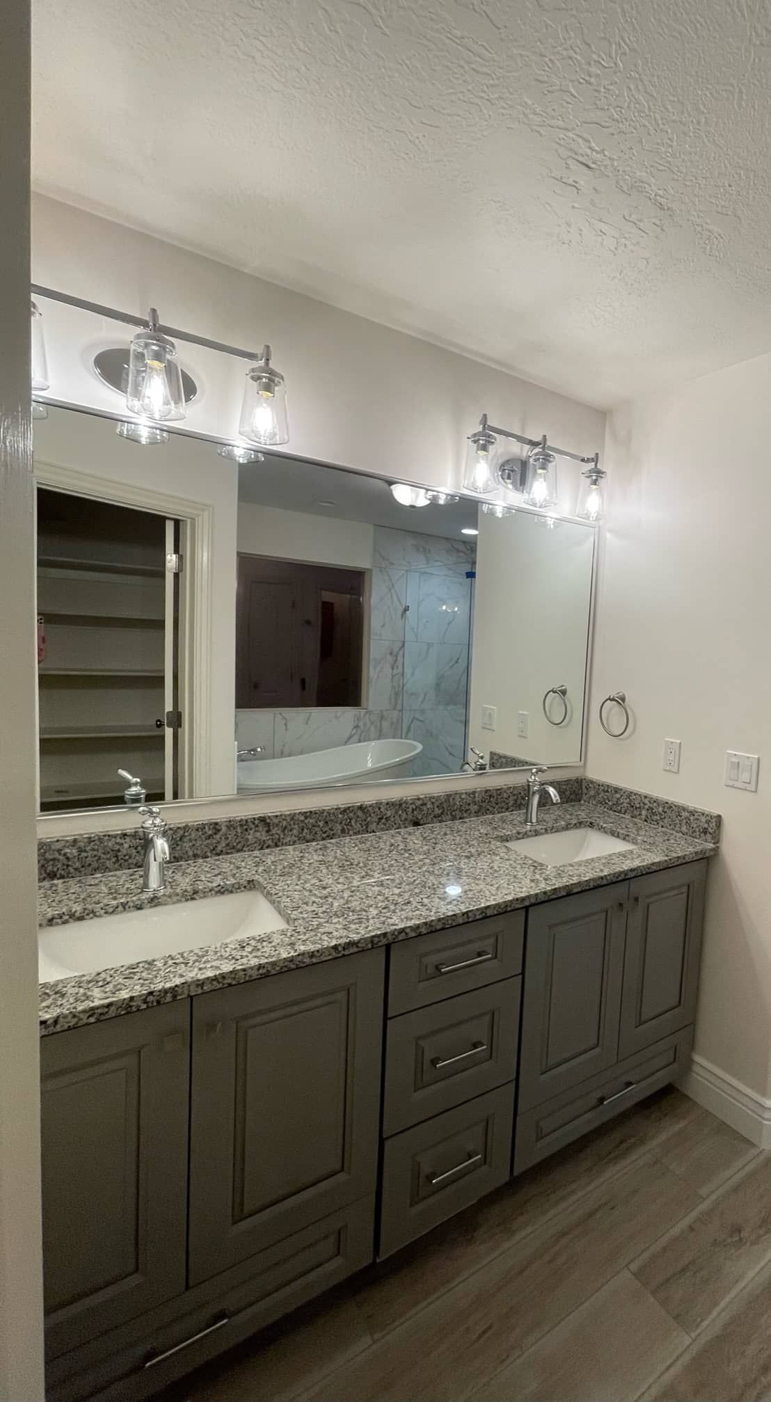 The bathroom remodel was quite extensive and even changed the layout. Our contractors demolished part of the wall to make more space for the toilet and a double vanity. We also installed a gorgeous new countertop and lights, and they installed new tile.