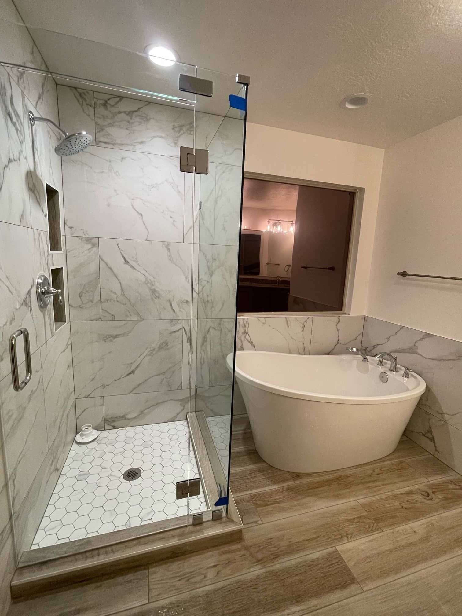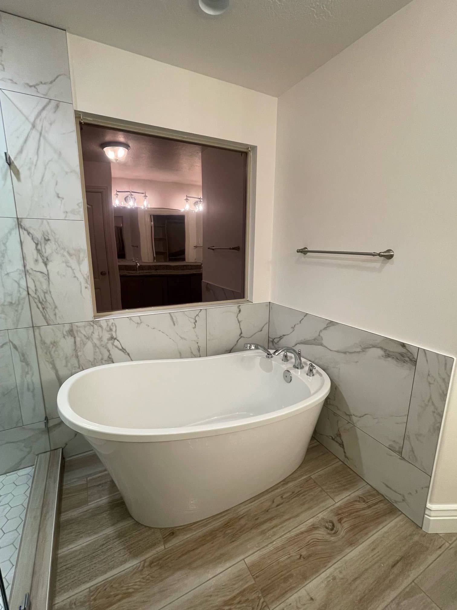 We even installed a stunning standalone bathtub and a walk-in shower. In this part of the bathroom, the homeowner opted for flooring that mimics the appearance of wood.