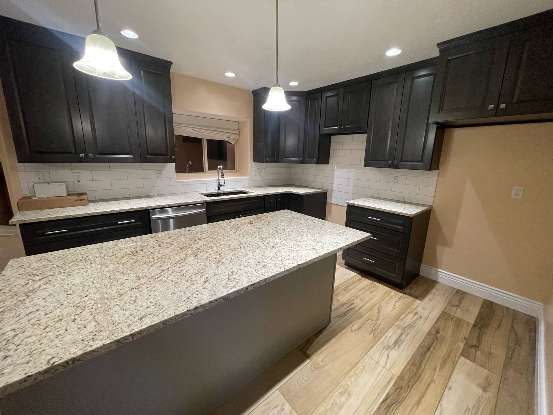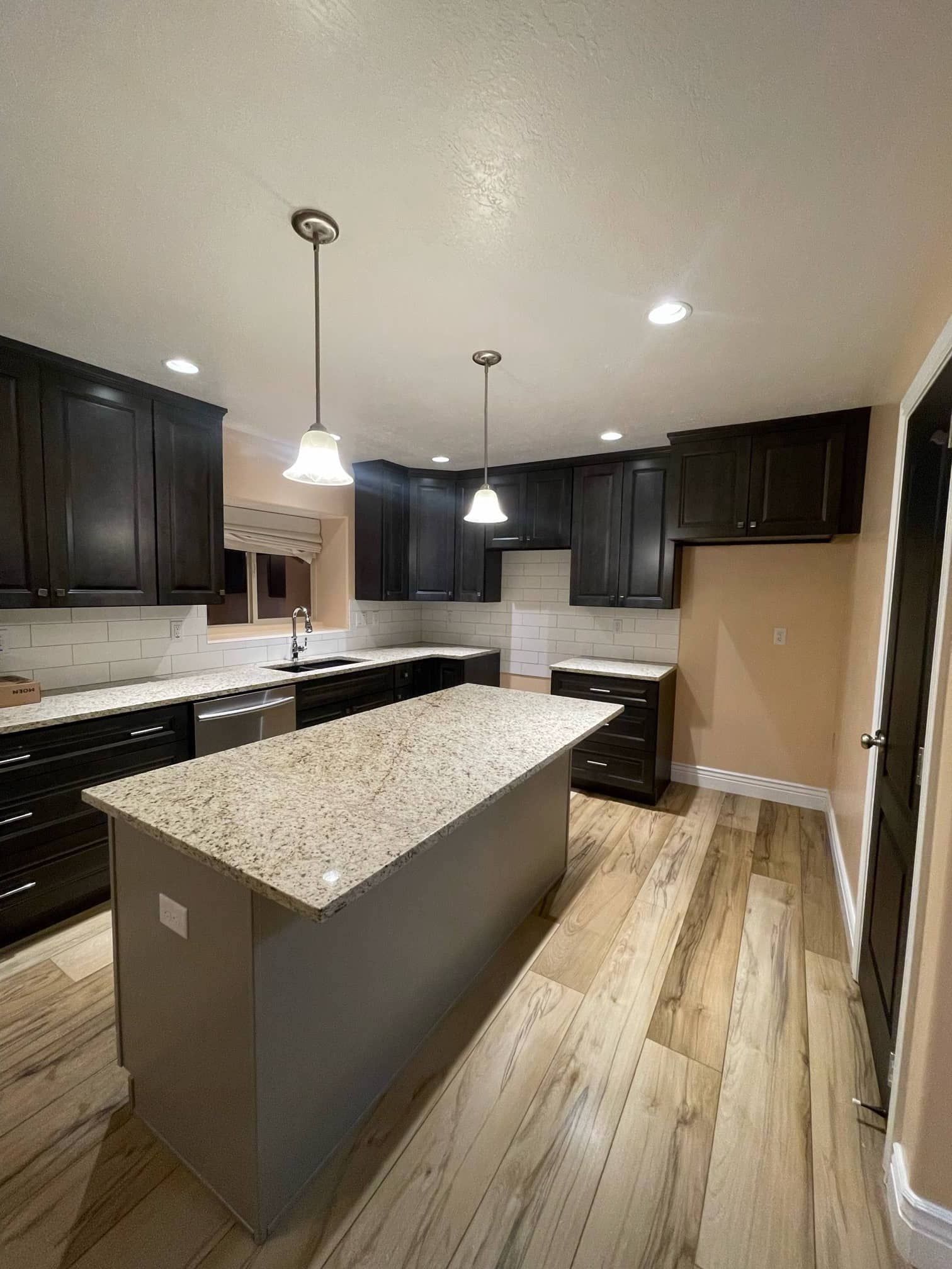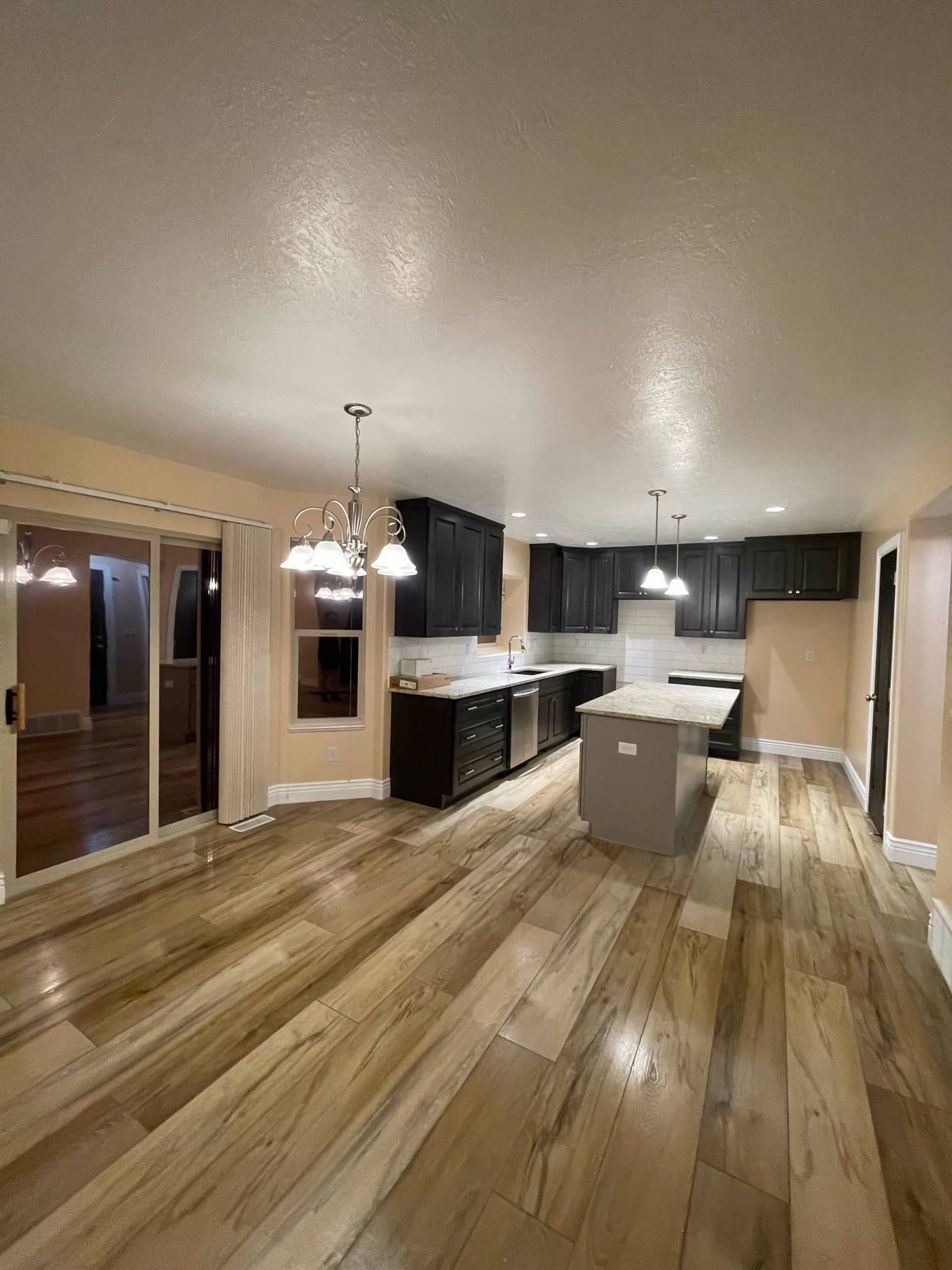 For the kitchen remodel, the flooring was all removed, as well as the appliances. The homeowner also opted to replace the cabinets and countertops. Our contractors then installed new black cabinets with a more modern design, and replaced the flooring with beautiful wood planks.